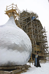 The first attempt to lift the major cupola has been planned on February 5 but was unsuccessful because of unexpected malfunctions in an electric equipment of the crane, although this event has been combined with a solemn ceremony. The Belarusian TV was specially inviting for this purpose. Therefore the gathered villagers and local heads went away and postponed this ceremony. The next attempt to set up the cupola to its permanent place was successful, but there were no TV and official solemn ceremony.