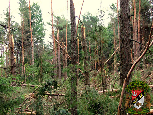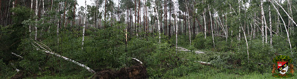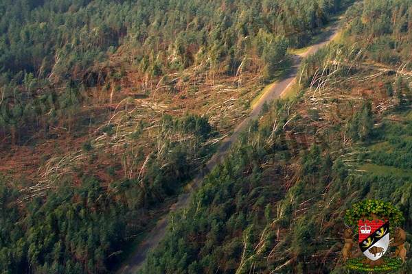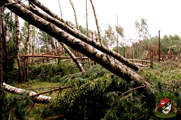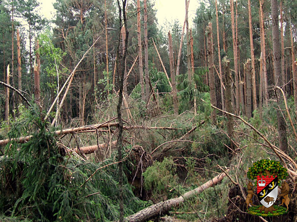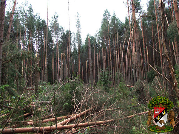 On July 2, 2011, a hurricane happened in the Porozovskoe forestry area located on the southeastern outskirts of the National Park "Belovezhskaya Pushcha". High-mast pines broke like chips and, despite a powerful root system, toppled under strong wind gusts. Trees were killed in the area of 5.2 ha. Skeletons of dying trees broken at a height of 3-5 meters and trunks lying on the ground were very numerous in place of the local windfall. According to preliminary calculations, the amount of dead wood is about 1,000 cubic meters. It should be removed as soon as possible to prevent pests and loss of quality wood. All the more so, the mass reproduction of the pine sawfly, damaging forest plantations is observed in the next Gomel region.