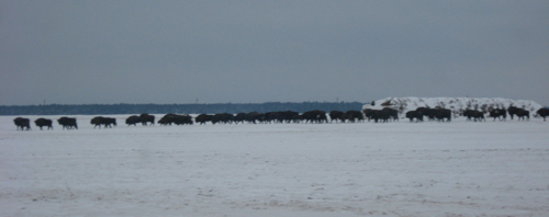 От Адрияновки сворачиваем в лес и долго едем по лесной дороге в сторону сельхозугодий ОАО «Мурава». Еще не доехав до опушки, сквозь поредевшие деревья видим: бродят наши зубры! Да не один-два, а сразу 15! Услышав шум машины, немедленно оттягиваются дальше в поле. Летом здесь росла сахарная свекла. Урожай убрали, но что-то осталось. Вот зубры и копытят землю в поисках вкусненького. Кормятся на полях они обычно ночью, днем нередко уходят в лес на лежку.
