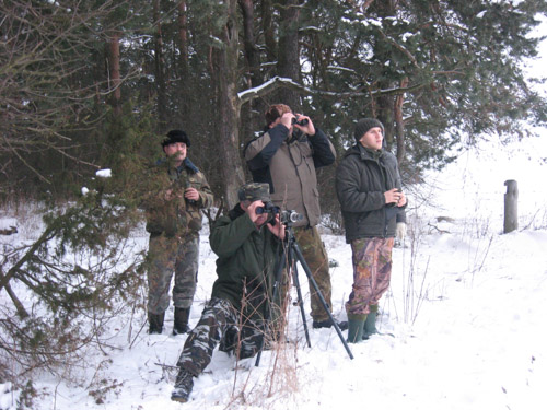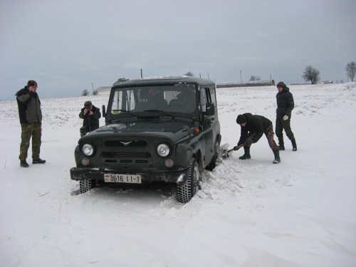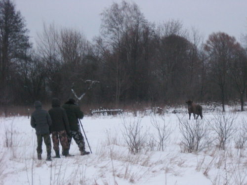 Мы грузимся в пущанский УАЗ и выезжаем из Каменюков в сторону Сухопольского лесничества, что в Пружанском районе. Именно там, по сообщениям егерей, сейчас самая высокая концентрация зубров. По дороге главный охотовед Олег Щитов и главный «зубровед» кандидат биологических наук Алексей Буневич вводят меня в курс дела. Учеты зубров, в отличие от других копытных, ведутся исключительно визуально, рассказывают они. Зимой зубры сбиваются в группировки, иногда очень большие, и держатся в местах кормежки, очень часто – на ближайших к пуще колхозных полях, где их легко подсчитать. В каждом пущанском лесничестве есть техник-охотовед и егерь, и считать зубров – их обязанность.