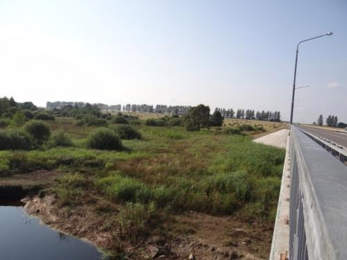 Через10 километров, около Новицковичей, делаем осмотр с моста новой объездной трассы. Здесь в воде признаков жизни тоже никаких. Полукилометровое убранное пшеничное поле от моста до поворота дороги имеет примерно 20-градусный уклон в сторону реки. Очевидно, что в этом месте небольшой травяной буфер поймы не преграда , и "химия" смывается дождями в Лесную.