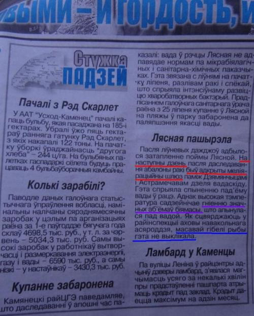Тут он спохватывается, посылает мальца в хату, чтобы принес газету. Нетерпеливо бежит сам, находит, развертывает на ходу: "Вот, "Навіны Камянеччыны". И читает про недавний потоп. "Лясная пашырэла. Пасля ліўневых дажджоў адбылося затапленне рэчышча... На наступны дзень быў адкрыты меліярацыйны шлюз паміж Дзямянчыцамі і Астрамечавам. ...Паводле райінспекцыі аховы навакольнага асяроддзя, масавай гібелі рыбы не было".
