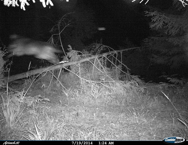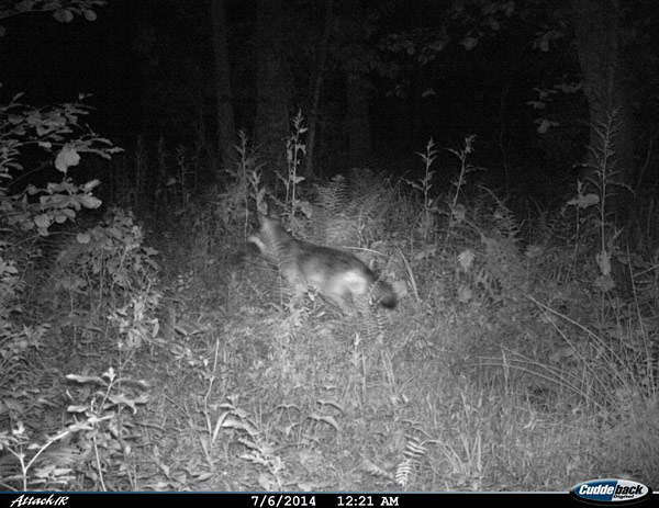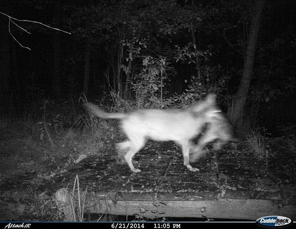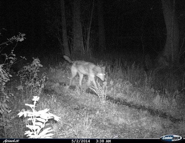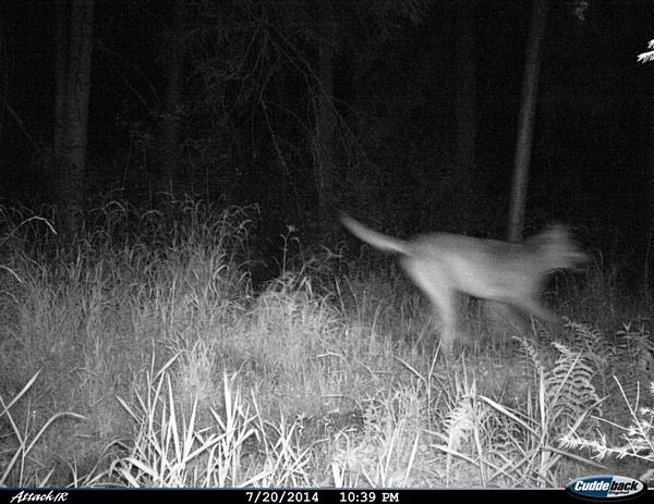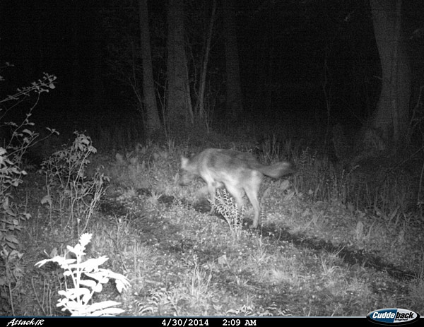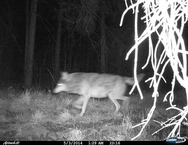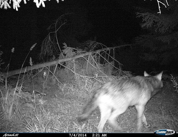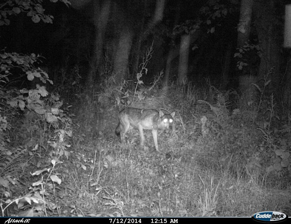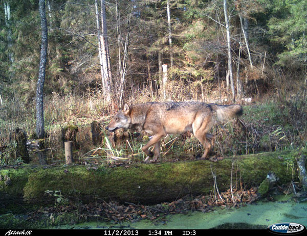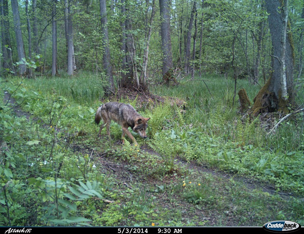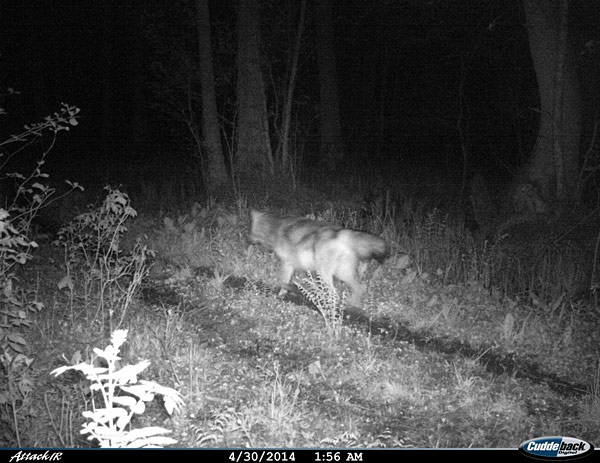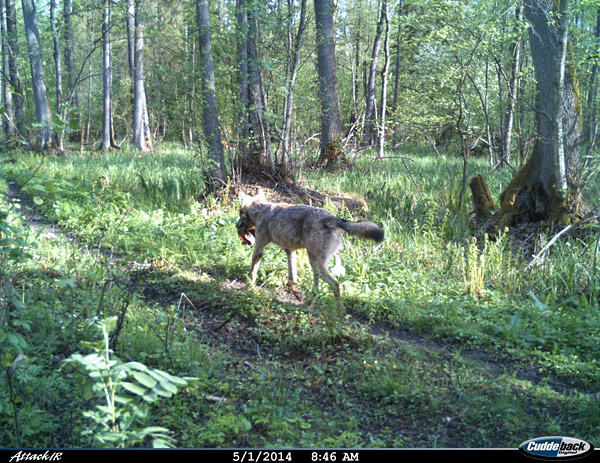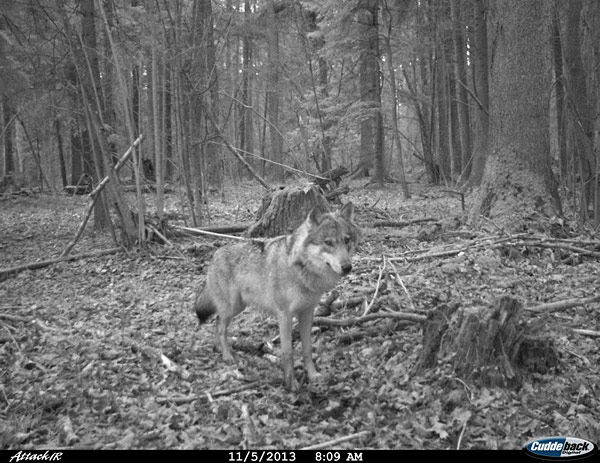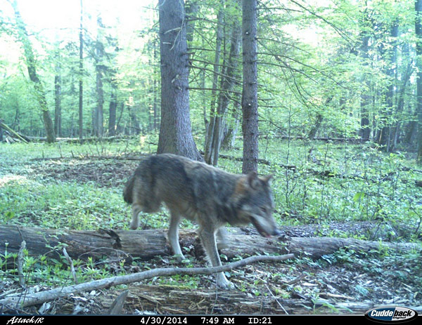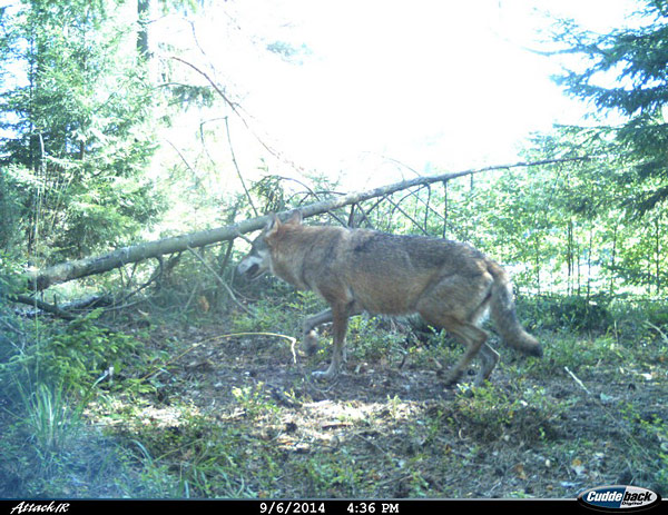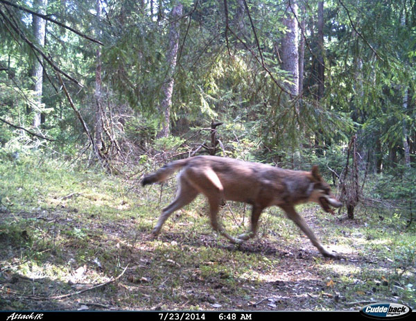 В июле фотокамеры начали фиксировать сцены охот волков на диких животных. На данном снимке волк подкрадывается к добыче.