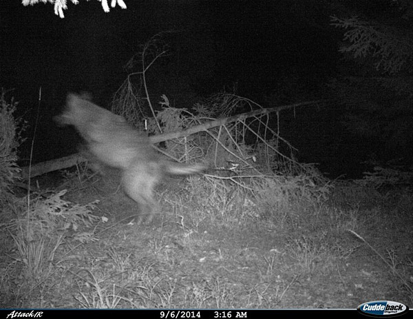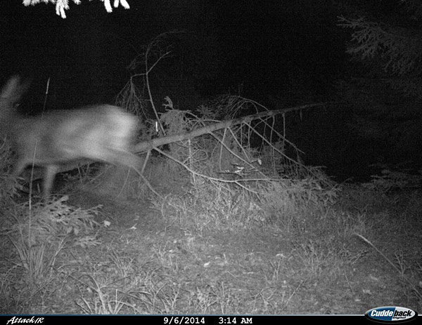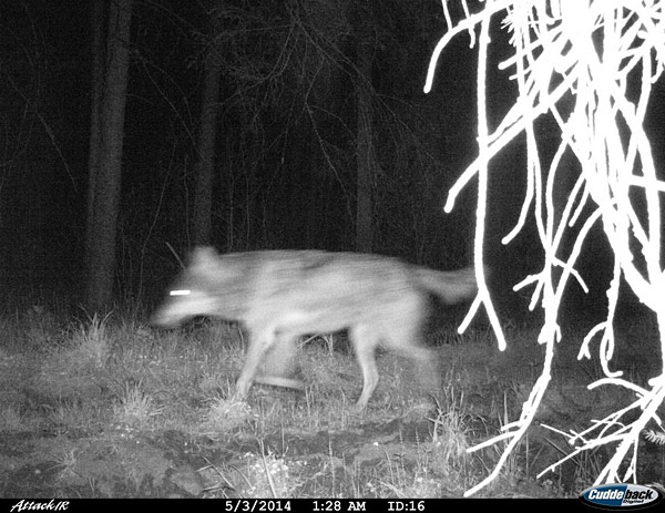 А это сцена преследования оленя, который пробежал ранее. Ночная видеосъемка в камере реагирует немного позже фотосъемки, но все же успела запечатлеть погоню за добычей. Длительное активное преследование жертвы нехарактерно для волков. Как правило, это короткий рывок на несколько десятков, реже – несколько сотен метров.