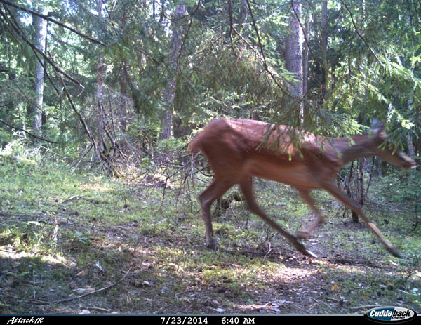 Вот еще одна сцена охоты волка на самку оленя. На утреннем снимке – убегающая самка оленя.