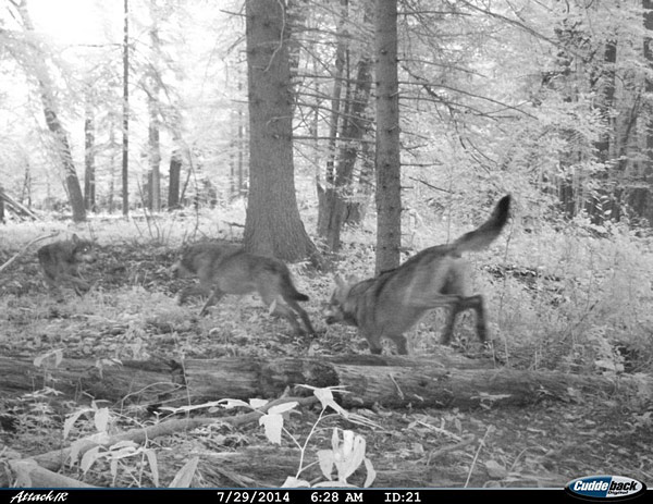 Последний снимок поразил нас. Похоже, нам удалось подсмотреть попытку передела территории. Началось формирование стай и изменилось соотношение сил. Но чем закончилась эта встреча волков, и было ли их больше трех, мы так и не узнали. Кульминация событий осталась за кадром. Может быть, последующие регистрации волков фотоловушками подскажут нам разгадку.