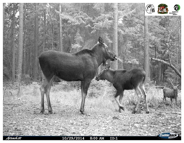 Сярод здымкаў з камер-фотапастак яшчэ не было лася. Выпраўляем сітуацыю – і адразу «сямейнае фота»! Колькасць лася ў Белавежскай пушчы невысокая. Гэты від аддае перавагу вільготным лясам, балоцінам, дзе яму дапамагаюць доўгія ногі і шырокія капыты. А вось навошта яму барада – на гэтае пытанне так і няма пэўнага адказу. Удзельнікі валанцёрскіх лагераў АПБ па ўліку вяртлявай чаротаўкі рэгулярна сустракаюць яго ў Белавежскай пушчы на балоце Дзікае. Зараз у лася гон — шлюбны перыяд. Калі ў аленя ён называецца «роў», бо самцы равуць уначы, то ў лася – стогн.