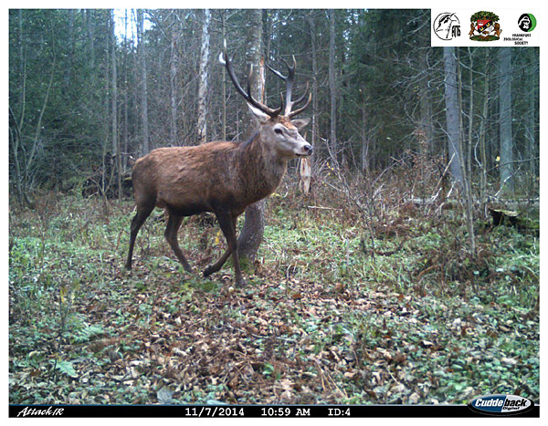 Перад намі — яскравы прадстаўнік белавежскіх аленяў! Звярніце ўвагу — на яго рагах пяць атожылкаў. Прынята лічыць, што па колькасці атожылкаў на рагах можна вызначыць узрост: колькі іх — столькі і гадоў. Але гэта не зусім так. Масіўнасць рагоў толькі прыкладна адлюстроўвае ўзрост і кажа аб агульным фізічным стане жывёлы. А да старасці рогі наогул дэградуюць.