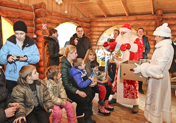 После таких незабываемых встреч с величественными обитателями пущи детей и взрослых встречал веселый и добрый Дед Мороз со своей неизменной спутницей Снегурочкой. Была и коварная Злыдня, козни которой дети легко разоблачали. Настоящее представление с участием всех гостей получилось возле елки во вместительном отапливаемом павильоне. Там были угощение и подарки.