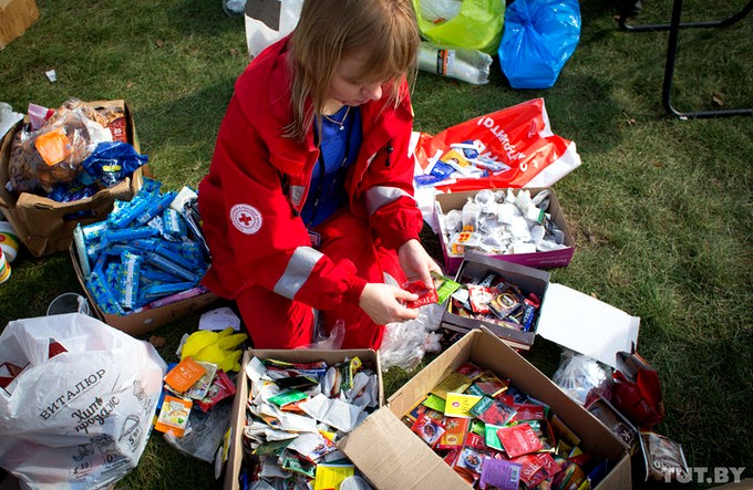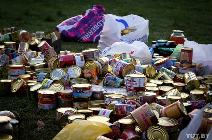 За несколько дней здесь образовался внушительный запас еды. Говорят, что продовольствие уже нести не надо, а вот резиновых сапог и дождевиков не хватает.