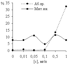 В качестве модельного тест-объекта использовали проростки ячменя сорта "Визит" и "Гонар". Эта культура рекомендована как возможный объект для цитогенетических исследований при изучении мутагенности факторов окружающей среды [4]. Семена ячменя проращивали в водных растворах препаратов при t=25°С. В контроле использовали семена, проращиваемые в дистиллированной воде. Концентрации испытуемых веществ подбирали экспериментально с учетом рекомендуемых для использования доз и с учетом их растворимости, а также их влияния на прорастание семян. Учитывали аберрации хромосом ана-телофазным методом, а также митотический индекс в корневой меристеме прорастающих семян.