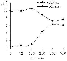 Рис.2. Влияние гербицидного препарата зенкор на частоту хромосомных аберраций и величину митотического индекса у Hordeum vulgare L. Сорт «Гонар»