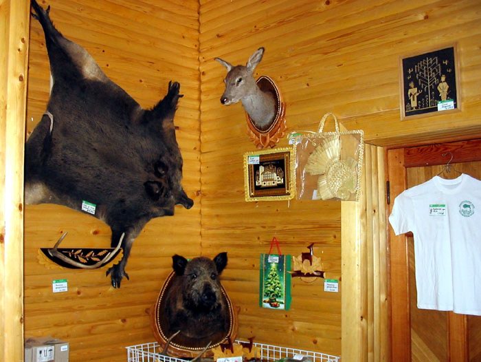 | Больше всего польских туристов поразил тот факт, что самый первый, входной зал в Музее природы, где начинается познавательная экскурсия о Беловежской пуще, посвящен не охране природы, а… охотничьей тематике. Тут же для туристов продают сувениры. Среди них – шкуры и чучела убитых животных. Сразу чувствуется "природоохранная" направленность "природоохранного" учреждения. |
