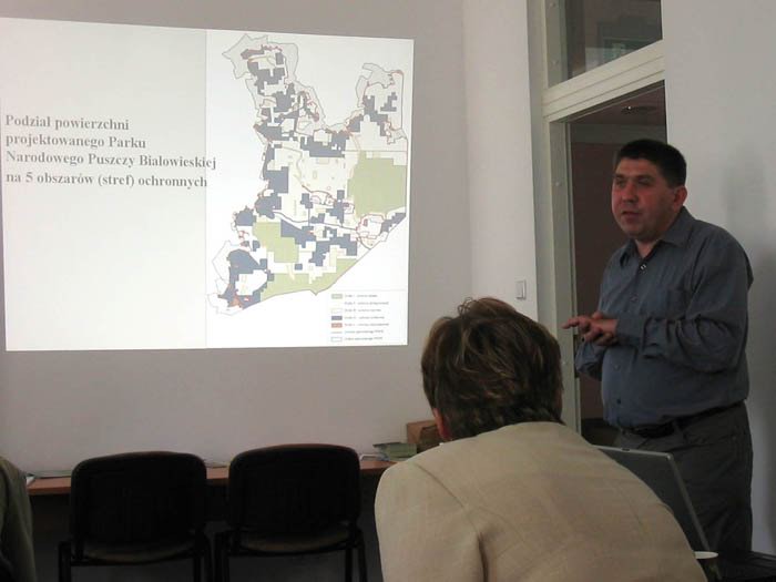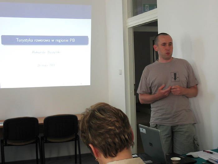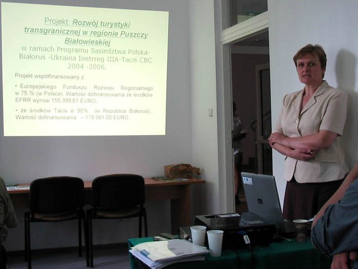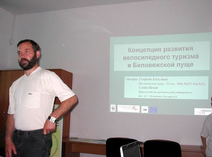 | 26 мая 2007 г. - начало семинара по подведению итогов Проекта "Пуща для велосипедов", который состоялся в образовательном центре в поселке Семянувка, что в польской части Беловежской пущи. | С докладом "Развитие велосипедного туризма в регионе Беловежской пущи в 2002 – 2006 гг." и "Велосипедный туризм и охрана природы" выступает руководитель Проекта с польской стороны Стефан Якимюк (Stefan Jakimiuk). |