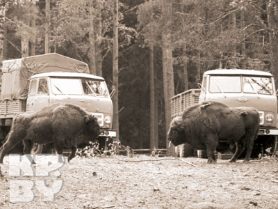 Ради этого кадра в Беловежскую пущи пригнали МАЗы (на капоте у этих машин изображены зубры). В засаде фотограф повел несколько часов, пока из лесной чащи не вышли истинные ее хозяева. В те времена фотошопа не было.