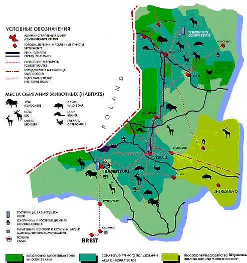 The Administrative Centre of the Belovezhskaya Pushcha National Park is situated in the village of Kamenyuki, at 20 kms north of the District center Kamenetz and 60 km north of the Regional centre of Brest.