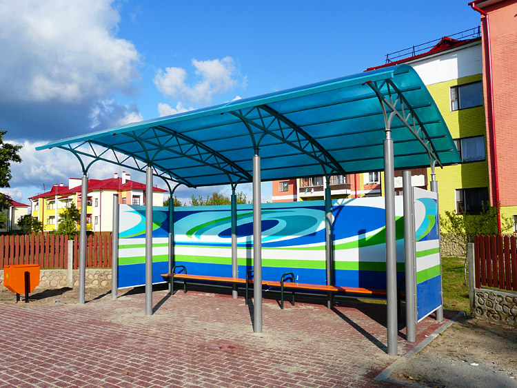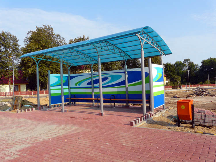 These pictures show the canopy over the bus stop completed and the workers cleaning up the area.