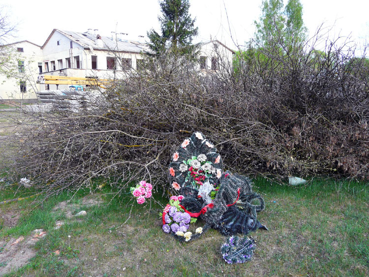 Later somewhat brought a funeral wreath next to the pile of branches, perhaps as a practical joke.