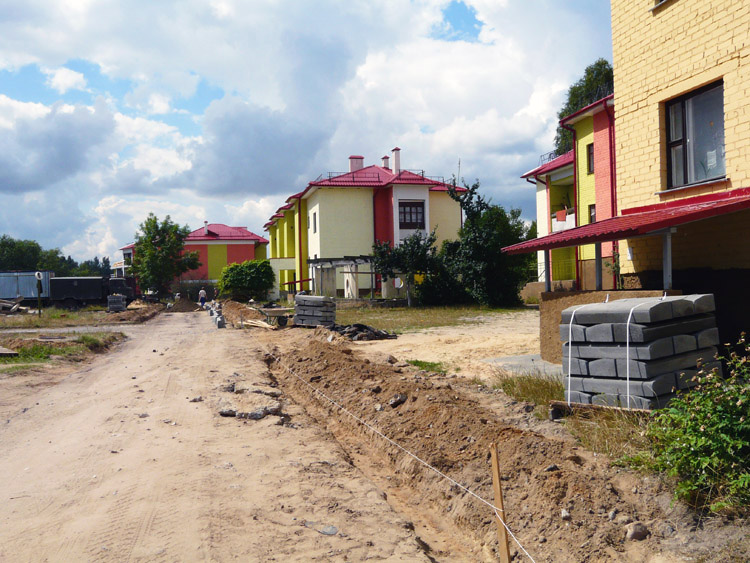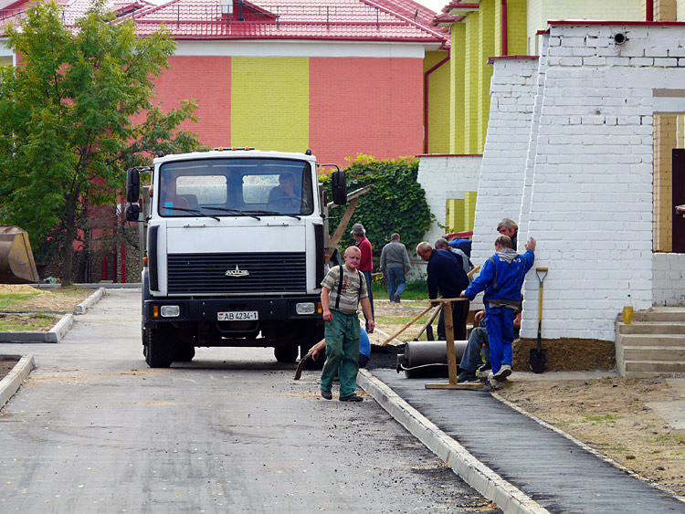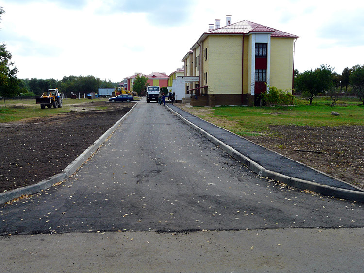 Builders asphalted pedestrian walks after the roadway in the backyards was paved with asphalt.