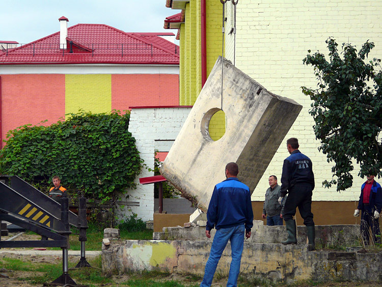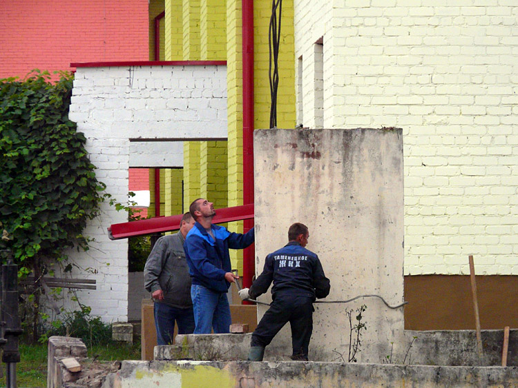Below: builders removing decorative structures that have lost their esthetic value with time.