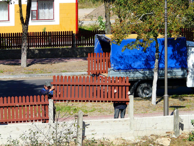 Sections of the new wooden fence were put together by district housing management workers and delivered to the village to be installed on the pre-fabricated footing. The first sections installed were painted in Kamenyuki.