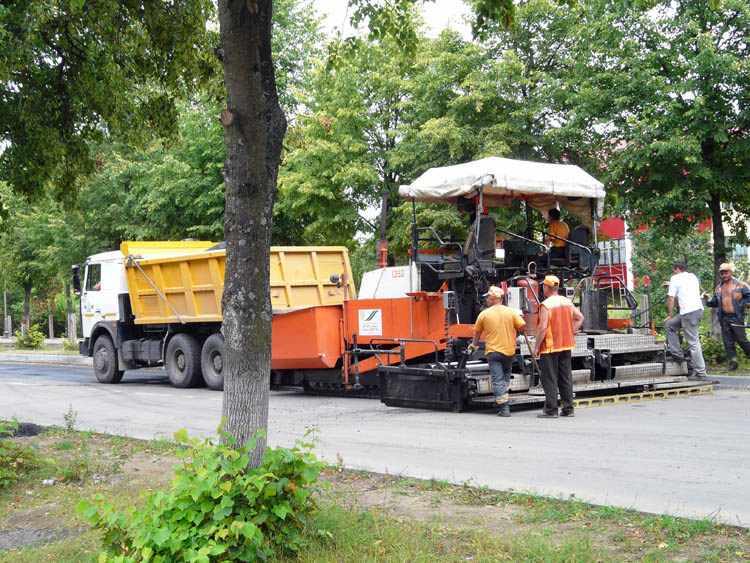 | (A paver and trucks with asphalt, July 20, 2009) |