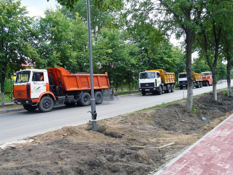 The shots below show delivery of black soil and filling of lawn pits, with the lime trees growing in them, in between the road and sidewalk.