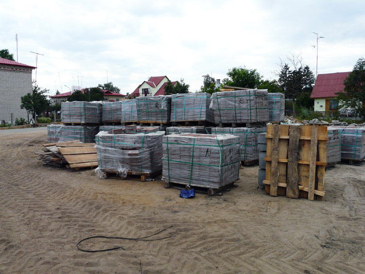 The shots below show curbstones installed along the sidewalks, as well as trenches filled with sand for installation of paving tiles.