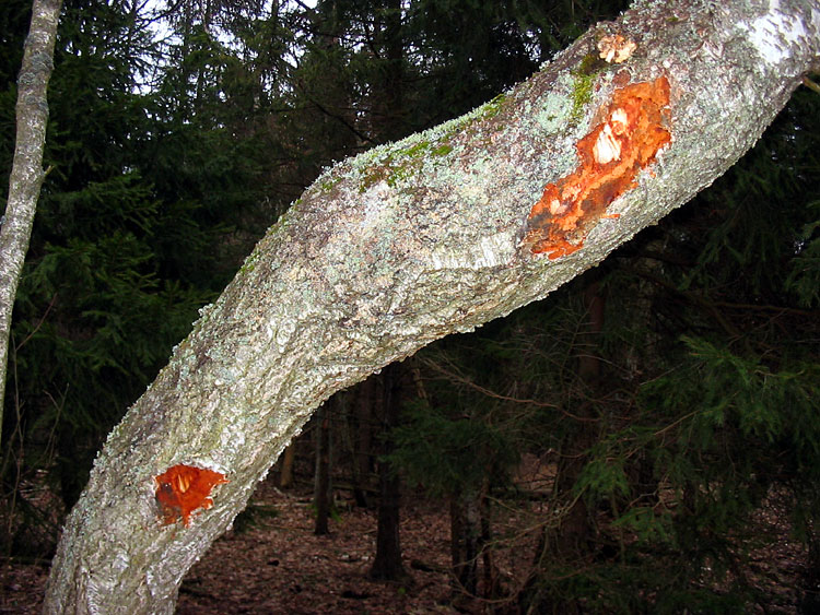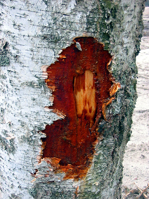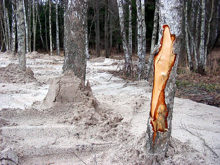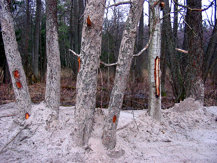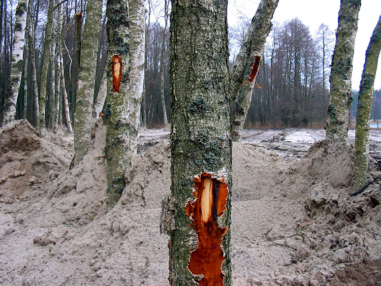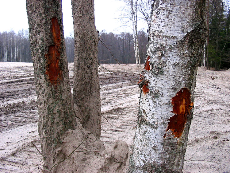 The shots below show the damaged trunks of birches and an alder.