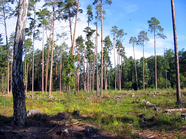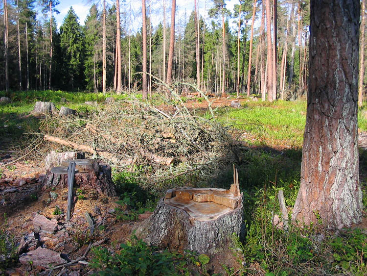 1. Dead and lost standing trees are felled completely. Only very slender trees which are even bad for fire wood are left. (Read about the ecological substantiation of inadmissibility of such the way of the forest management here).