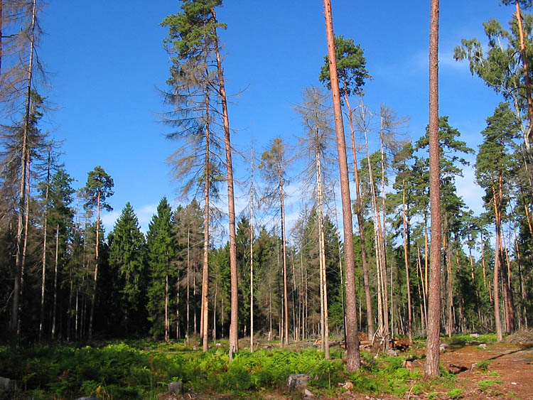 The pine stand with a high share of spruce trees grew in the compartment 802. In 2001 a few bark beetle pests' centers appeared. Dying and already dead trees were cut down, however, it did not stop bark beetles which spread to the biggest area and caused the destruction of a part of spruce stands over 2 years there. By 2005 the bark beetle outbreak calmed down by itself, in spite of the fact that the woodcutters did all possible for its further expansion and prolongation.