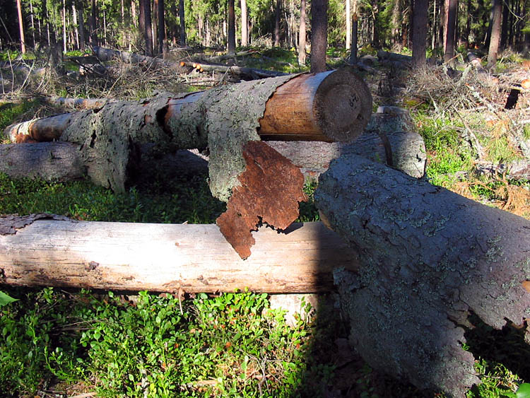 A spruce tree of the big size with the wood damaged by bracket-fungus is shown below. Its body is well visible on the cut surface of the log left in the forest. This testifies that these logs are lying there for many years, due to that the bracket-fungus had even time to produce the fungus-body.