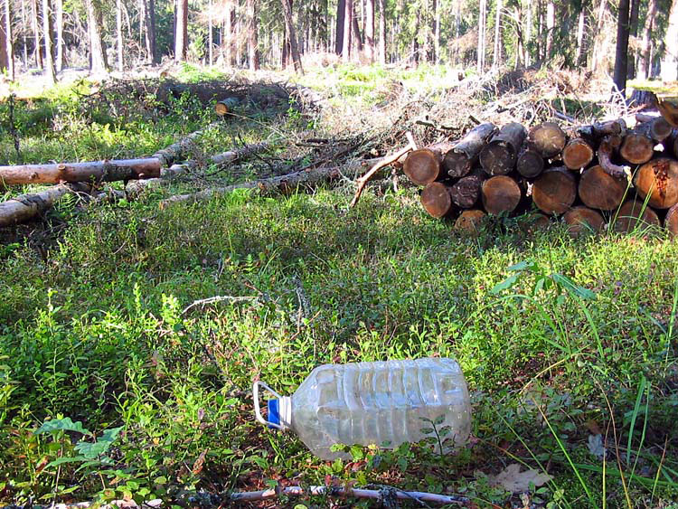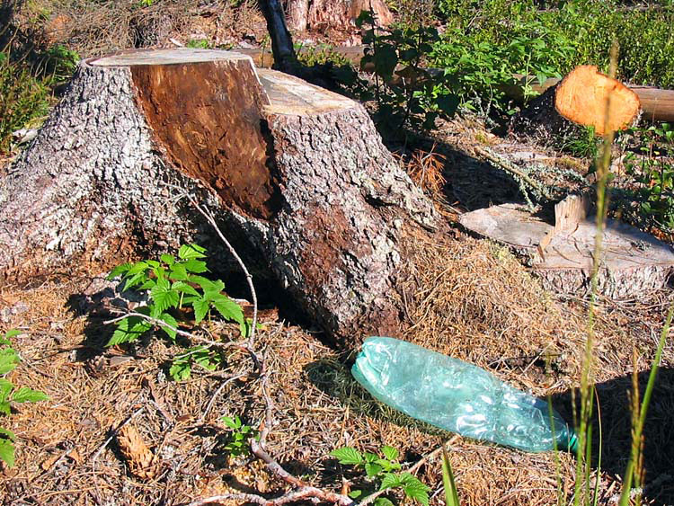 5. Plastic bottles thrown out by woodcutters are on the cutting area that results in the unnecessary pollution of the forest by rubbish.