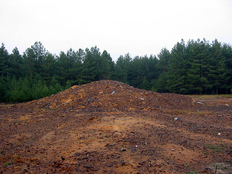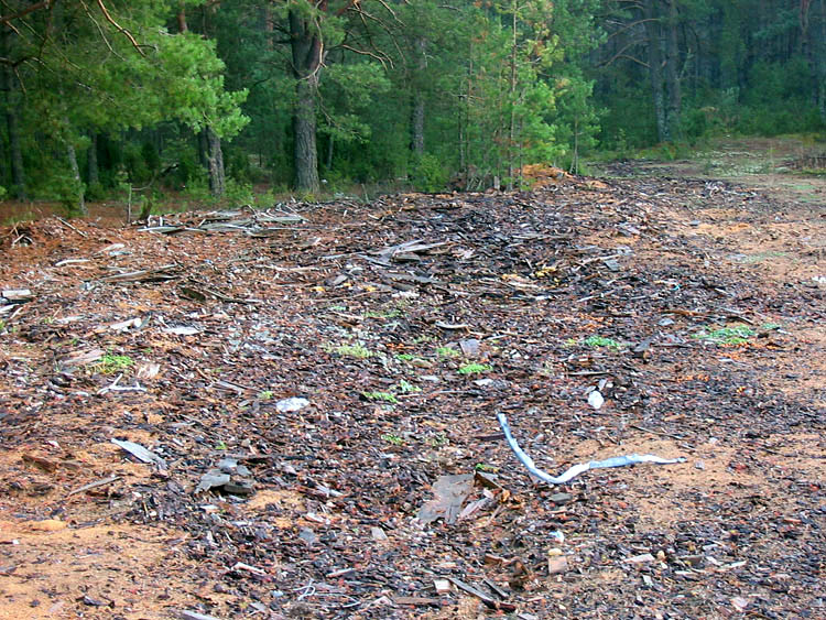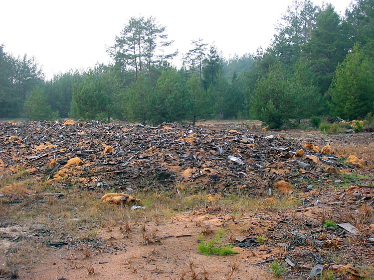 As has already been specified in older pages, the administration of the National Park has created a (non-authorized and illegal) dumping ground in a pine wood 1.5 kilometers from the village of Kamenyuki. Inspection revealed that rubbish is not delivered any more there. Even some imitation of cleaning of the territory have been carried out – a part of household and building rubbish have been taken out, while the other part (heaps) have been leveled by bulldozer and have been covered with ground, sawdust and wastes of wood processing.