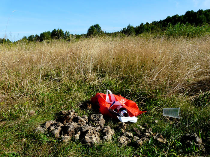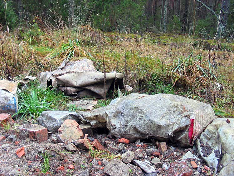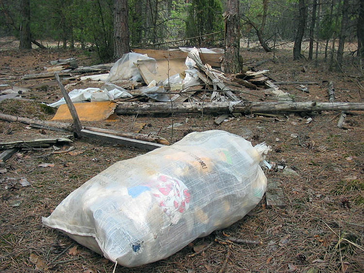 | (A heap and a bag with rubbish in the forest close to a sawmill area; May 05, 2006) |