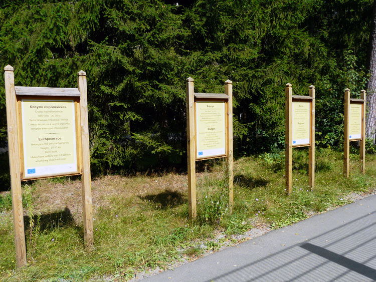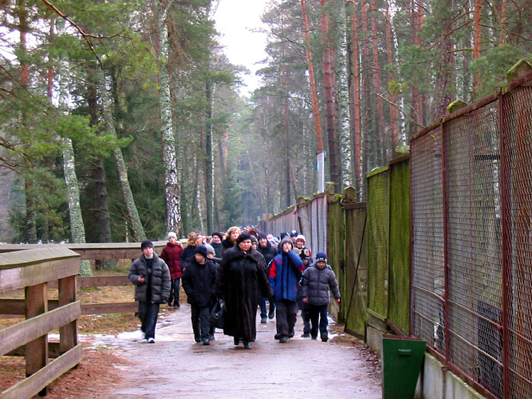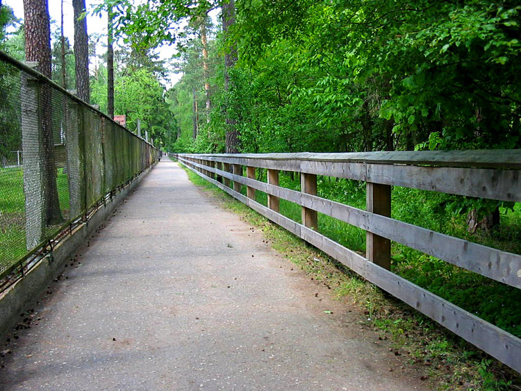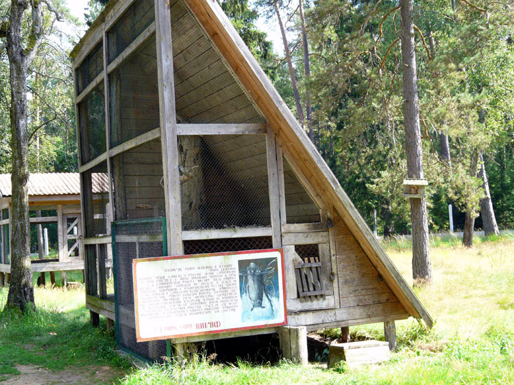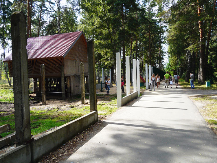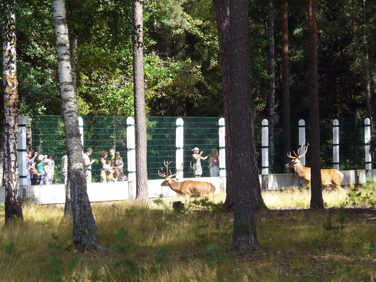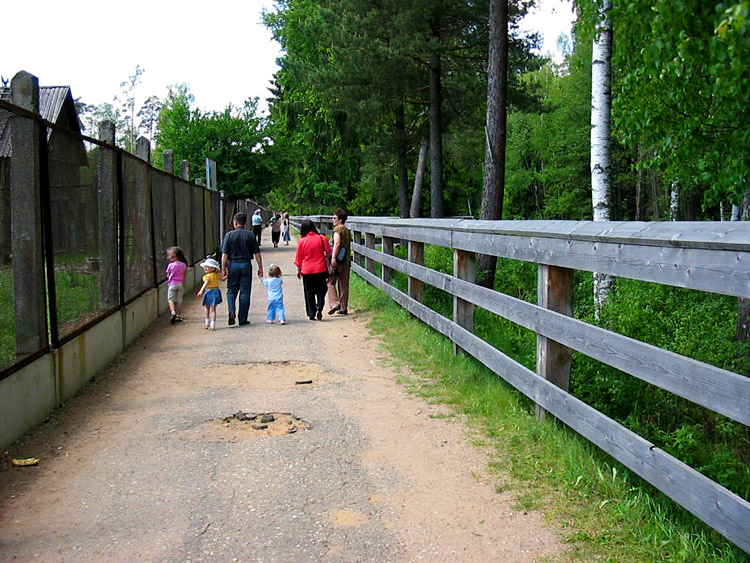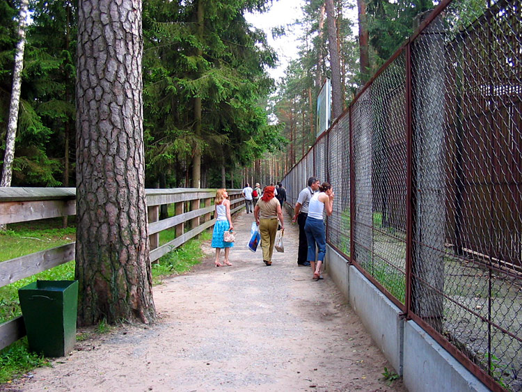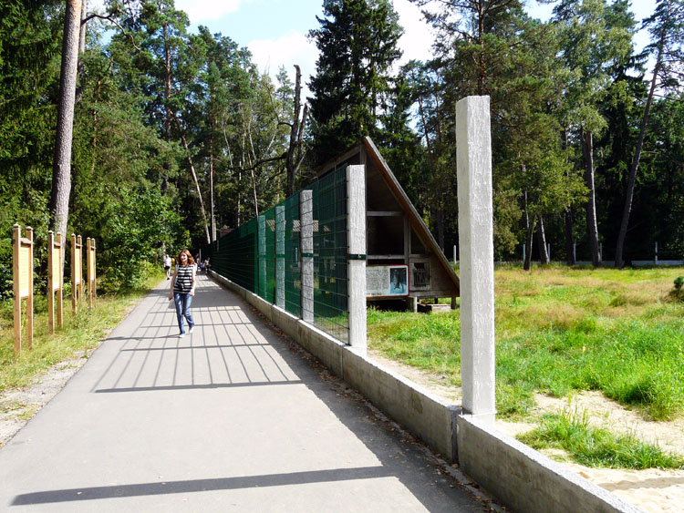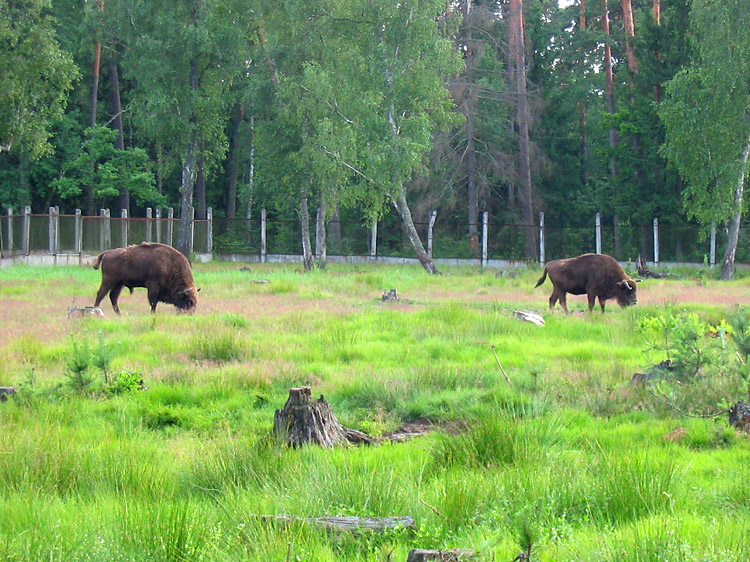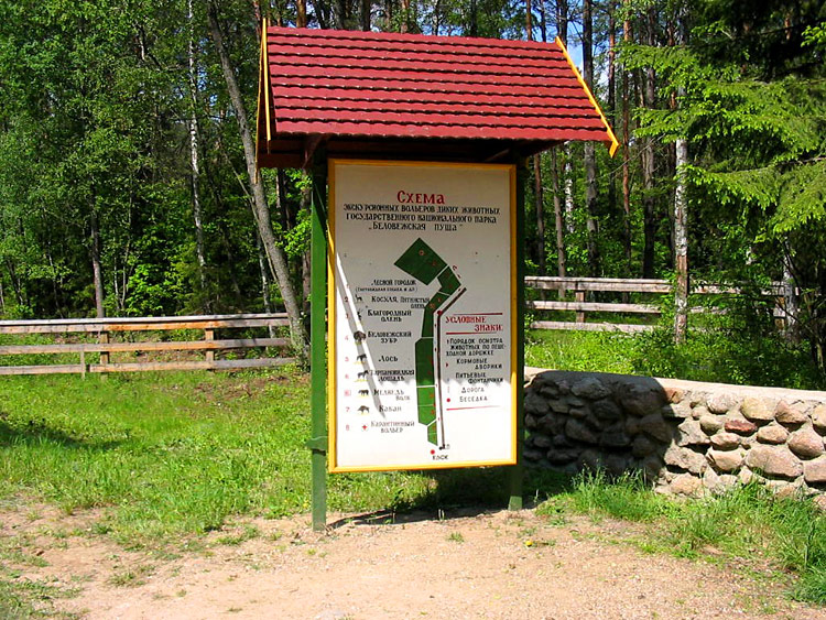 Events, facts, documents and evidence: The National Park "Belovezhskaya Pushcha" has zoo enclosures where wild animals live bison, deer, wild boars, elks, tarpan-leke horses, bears, wolfs and some other small mammals, and ān eagle owl (of birds). The enclosures make a daisy-chain structure of small-sized areas fenced with a metal wire netting and the animals live within their limits. An asphalt path along the enclosures is used by tourists to walk and look at the inhabitants of Belovezhskaya Pushcha. The length of the enclosures is approximately 1 kilometer.