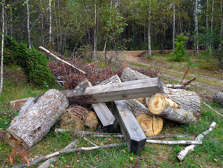 | (Wood poles in the forest among firewood; September 06, 2009) |