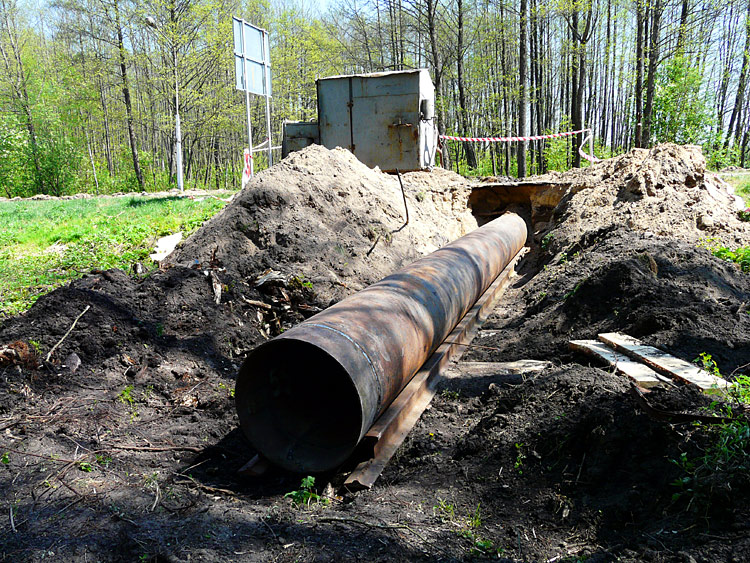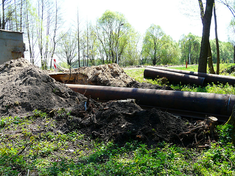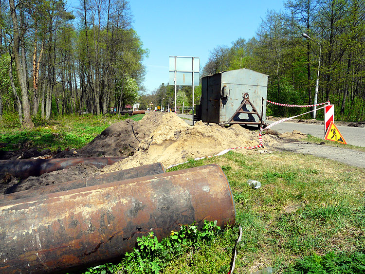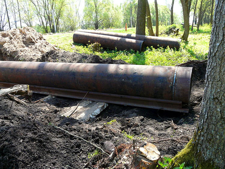 The pictures below show the tunnel construction beginning in the spring of 2009. Workers have brought large metal pipes and are installing them under the roadway.