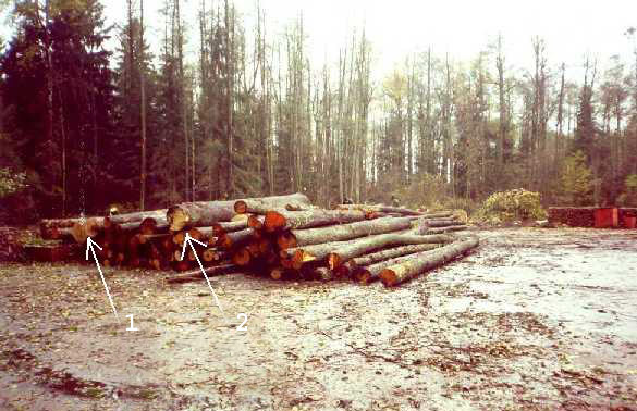 These photos show the site where the Alder forest has been felled (photo 1) as well as a stack of timber made up of living Alder (photo 2). On the enlarged picture arrow 1 points at the 150 year old, remarkable, vital and healthy Pine, arrow 2 points at 100 year Alder. The intervention can be classified as murder on living trees, a clear infringement on the regulations, adopted on a touristic hotspot within Belovezhskaya Pushcha. The felling of these healthy trees is not just illegal, by doing so at this specific spot the management of the National Park acts unresponsable towards their educational role as well as it contradicts to the goal of creating awareness of the respect our natural heritage deserves.
