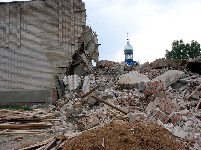 | A church against a background of the destroyed house of culture (June 9 and 10, 2007) |
