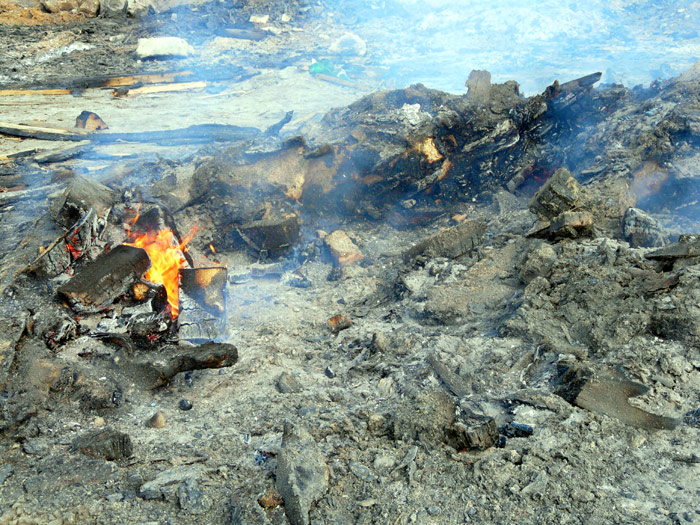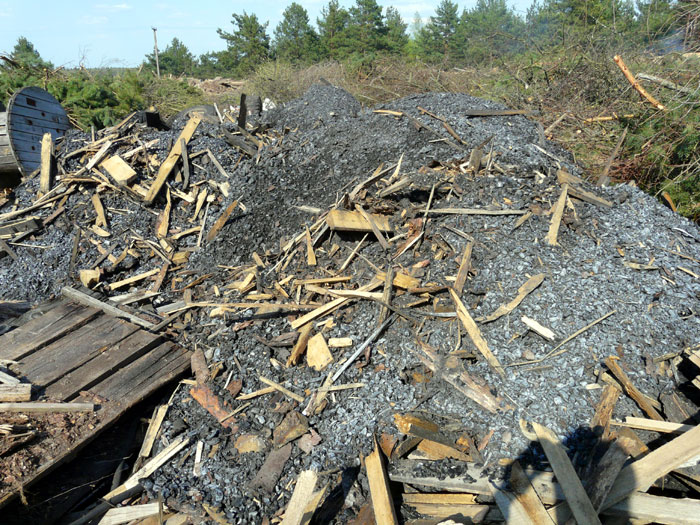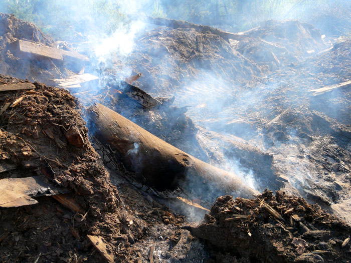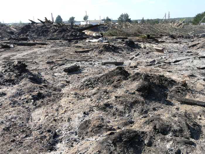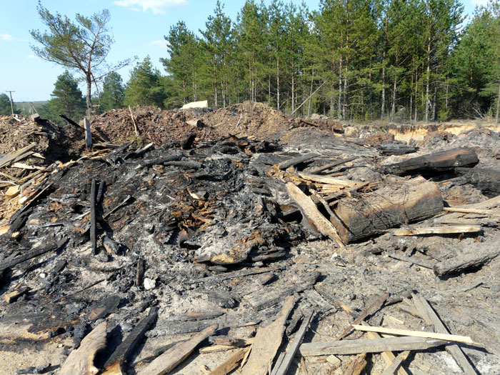 These photos show plots of the dump on which rotten wood and timber plank off-cuts have already been burned. There are heaps of wood ashes and black firebrands.
