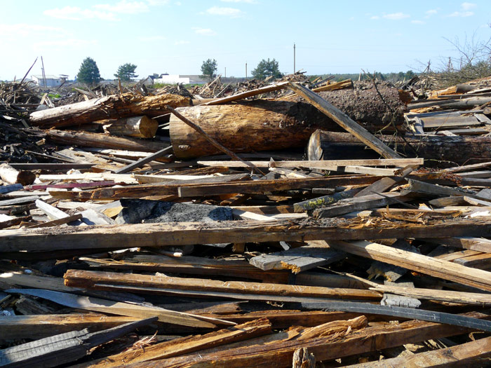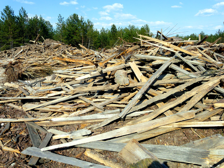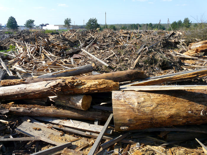 Heaps of wood waste and timber off-cuts carried away and dumped are shown here. Among them there are rather big logs and their cut-parts which were lying earlier in the area of the wood processing shop to become rotten.