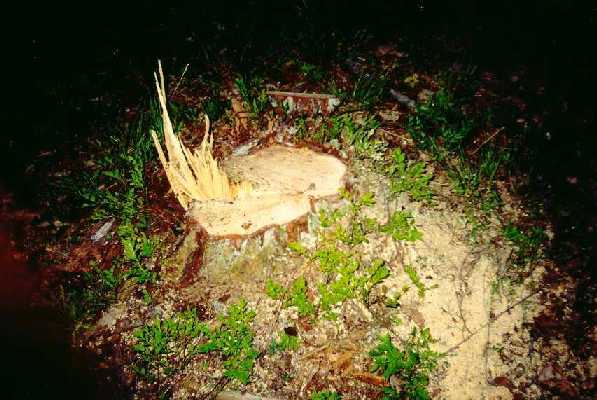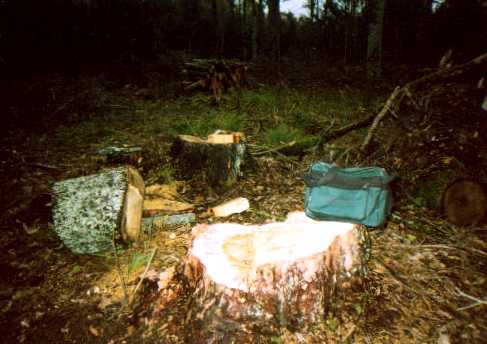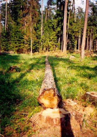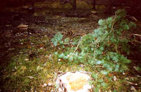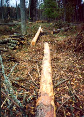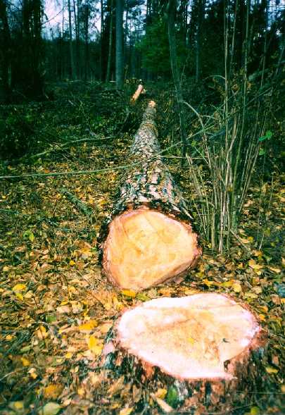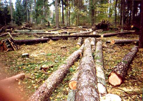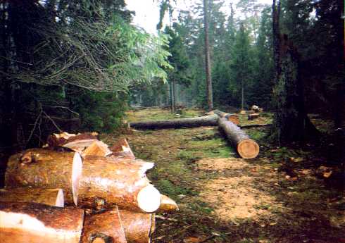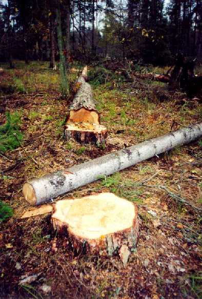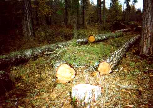 When places where illegal felling of living Pines may have been brought into practice were inspected in June 2002 at the Paskuhkovskoe forestry area the majority of the felled Pines had been taken away at that time. However the woodcutters had «forgotten» to remove a number of Pines which had been cut down before their natural death struck them