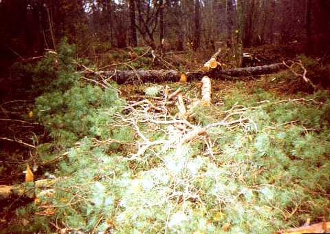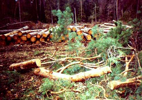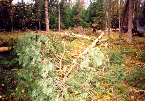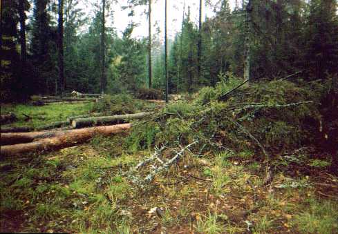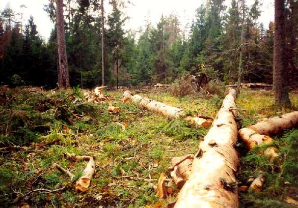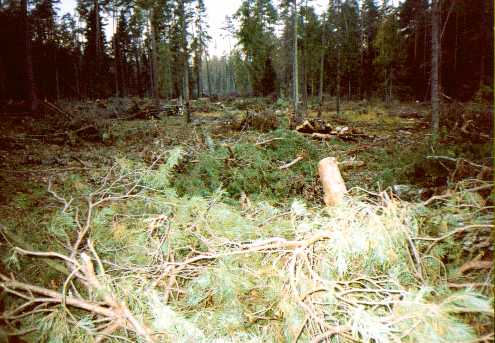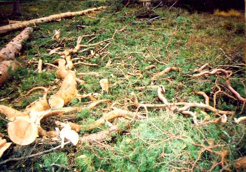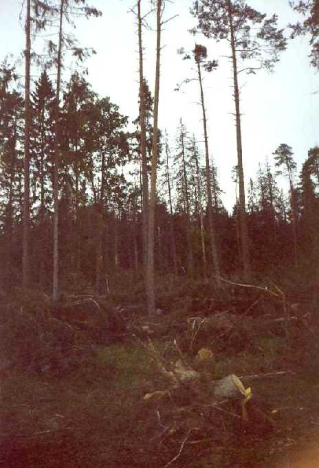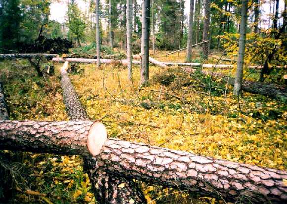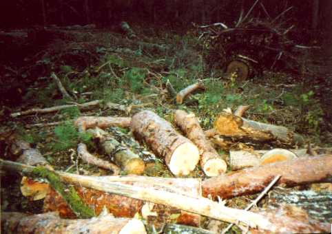 The pictures present that elite Spruce-Pine forest of old-age bordering to a site damaged previously by the hurricane is being felled. The action resulted in hundreds living Pines of old-age being subject to the destiny of early death imposed by human axe.
