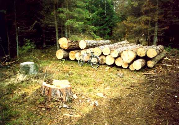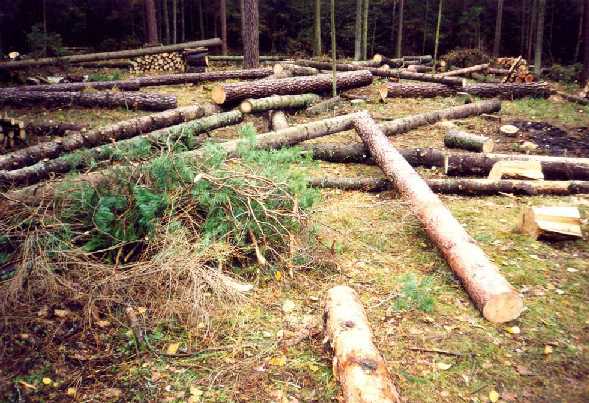 Stacks have been grouped here of Pine timber, including trunks of Pines which were alive at the moment they were pulled down.