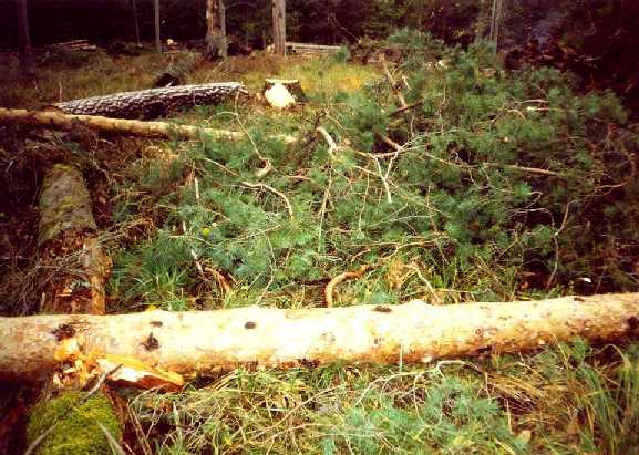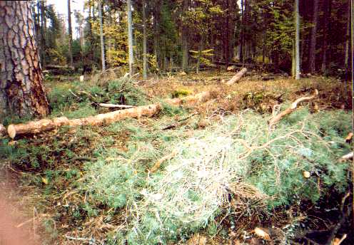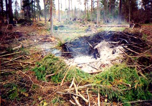 In autumn woodcutters tried to burn the fresh branches with green needles after the felling of living Pine and Spruce was conducted. However, fresh branches that could not be burned are visible here.