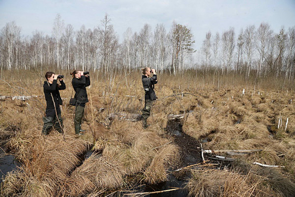 In day they again divided into groups - some who had long boots goes to check platforms for great grey owl on the island of the fen, and who had short boots do the same work, but only in the forest. As a result of hikes, due to indirect evidences (excrement stains, bird casting), it became clear what platforms are interested by owls and what ones are not. Besides, many of the participants brought a bunch of impressions from marshes, and at the same time boots full of water. Two groups were fortunate to meet an elk, and at other times to see quite close the cranes. And of course, one must not forget the long way of stragglers to get land as they were trying over an hour to overcome the open marsh of the width of 300 meters.