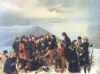 Охота, как правило, завершалась торжественным обедом. Вся добыча свозилась ко дворцу и укладывалась в определенном порядке. Первый ряд занимали трофеи, добытые императором, затем - прочих участников охоты. К этому времени составлялись списки добытой крупной дичи, часть которой передавалась участникам охоты, другая - в собственность анатомических музеев Академии наук, Академии художеств и университетов.
