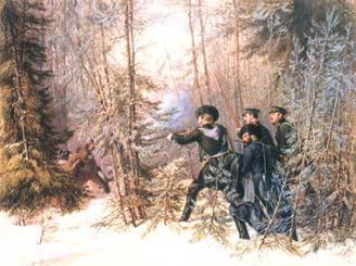 | Ф. Тейхель. Наследник цесаревич Александр Николаевич, стреляющий в медведя |