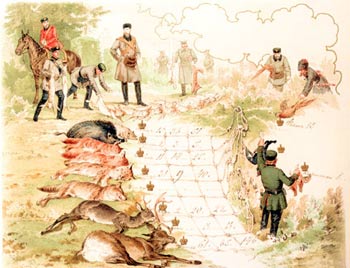 Наряду с Гатчиной любимым местом охоты императора Александра II была Лисинская казенная дача, принадлежавшая Министерству государственных имуществ. Она располагалась в 17 верстах от станции Тосно Николаевской железной дороги. Среди многочисленных царских охотничьих угодий Беловежская пуща являлась особо ценным заказником. Она размещалась на площади 1076 квадратных верст. На ее территории обитали зубры, лоси, косули, кабаны, зайцы, волки, лисицы, куницы, рыси, а из птиц - глухари, тетерева, рябчики, бекасы, журавли, цапли, совы. Беловежская пуща вошла в состав России в 1794 году, после третьего раздела Польши между Россией, Австрией и Германией. В 1803 году император Александр I объявил Беловежскую пущу заповедной зоной. С этого времени охота на зубров разрешалась только по особому высочайшему повелению. Звери тщательно охранялись. Даже участникам императорской охоты был доступен отстрел только отбившихся от стада зубров.